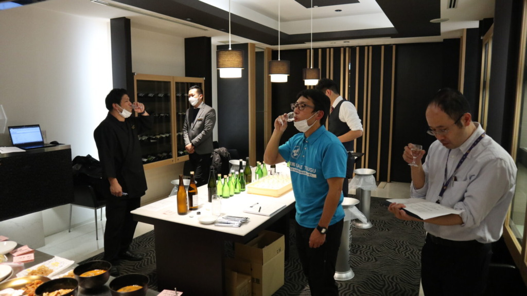 ホワイトイン高崎の荒井総料理長、群馬産業技術センターの渡部さんと栁澤さん、そして、群馬SAKE TSUGUの清水の4名で検討させていただきました。