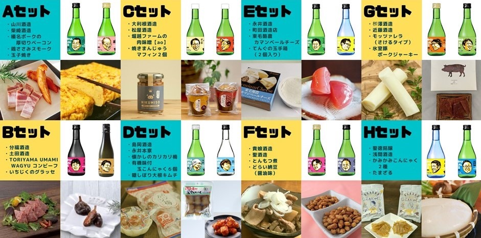 そんな考えで、地酒2蔵、食品2社のセットを8種類作ることにしました。