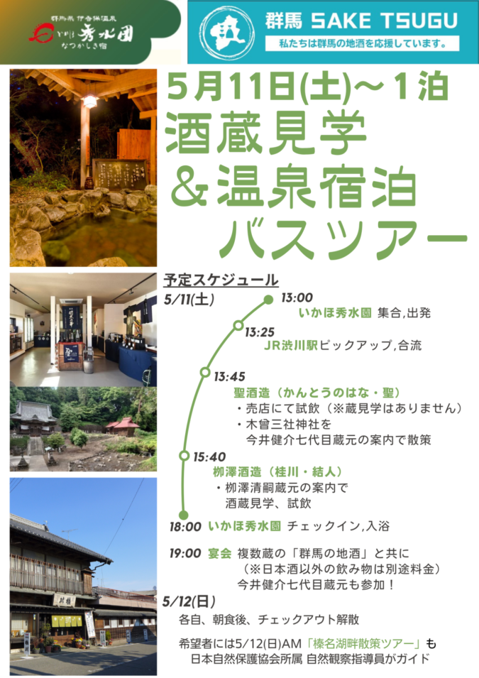 ゴールデンウイーク明けの5月11日(土)、伊香保温泉いかほ秀水園を発着点にバスツアーを開催します!(行きは渋川駅でもピックアップ)