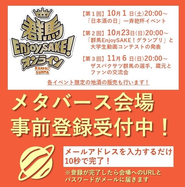 - 10月23日(日)20時から 群馬EnjoySAKE!グランプリや大学生動画コンテストの結果発表など