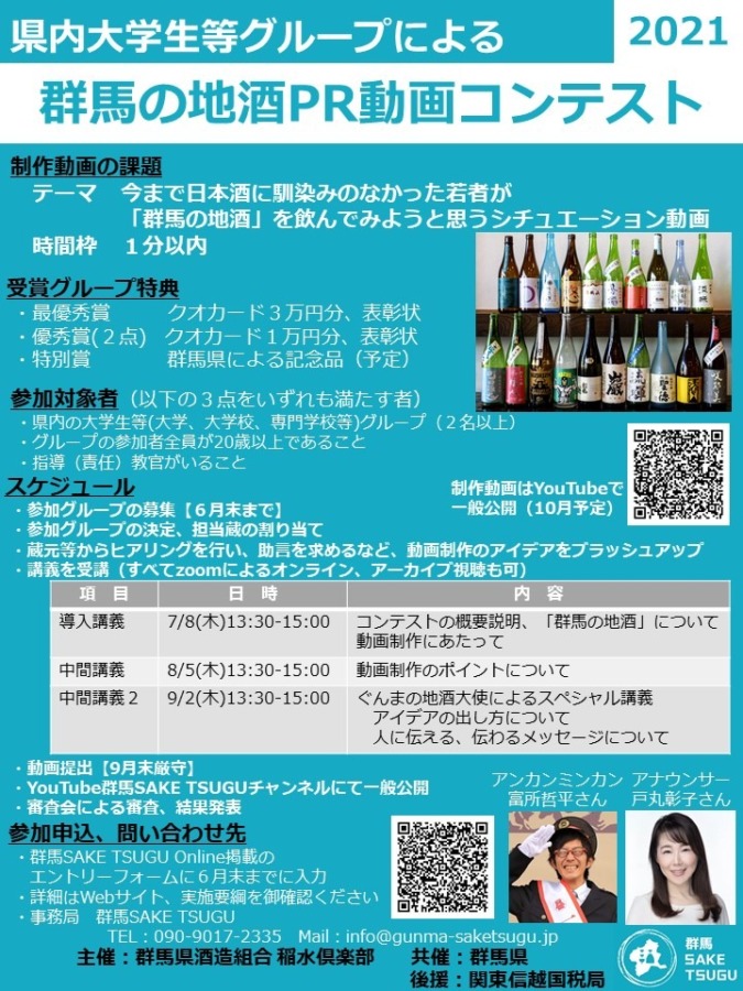 コンテストを通して、県内の大学生等が「群馬の地酒」や造り手である蔵元等、地域産業の担い手に触れながら、その魅力を伝えるPR動画を制作し、その動画をYouTubeで広く公開することで、これからお酒を飲み始める若い世代に「群馬の地酒」の魅力をPRするものです。