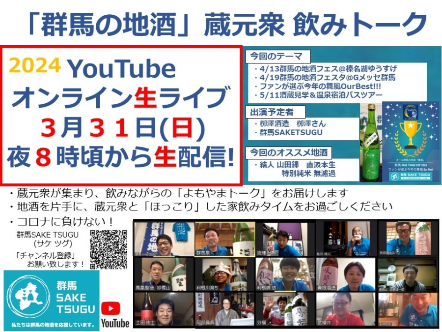 「群馬の地酒」を応援している群馬SAKETSUGUが、「群馬の地酒」蔵元や杜氏らをゲストに招き、飲みながらの生トークライブを配信。