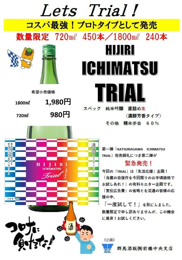 TRIALシリーズ第2弾聖酒造さんからTRIALシリーズ第2弾 HIJIRI ICHIMATSU TRIALが発売されました! お手頃価格でのご提供です。数に限りがあるのでお早めにお求めください!報告する Tweet Share +1 Pocket Pin it 「群馬の地酒」蔵元衆飲みトーク2020/5/31土田酒造:【奇跡の入賞酒 予約販売開始】コメントこの記事へのコメントはありません。コメントするためには、 ログイン してください。