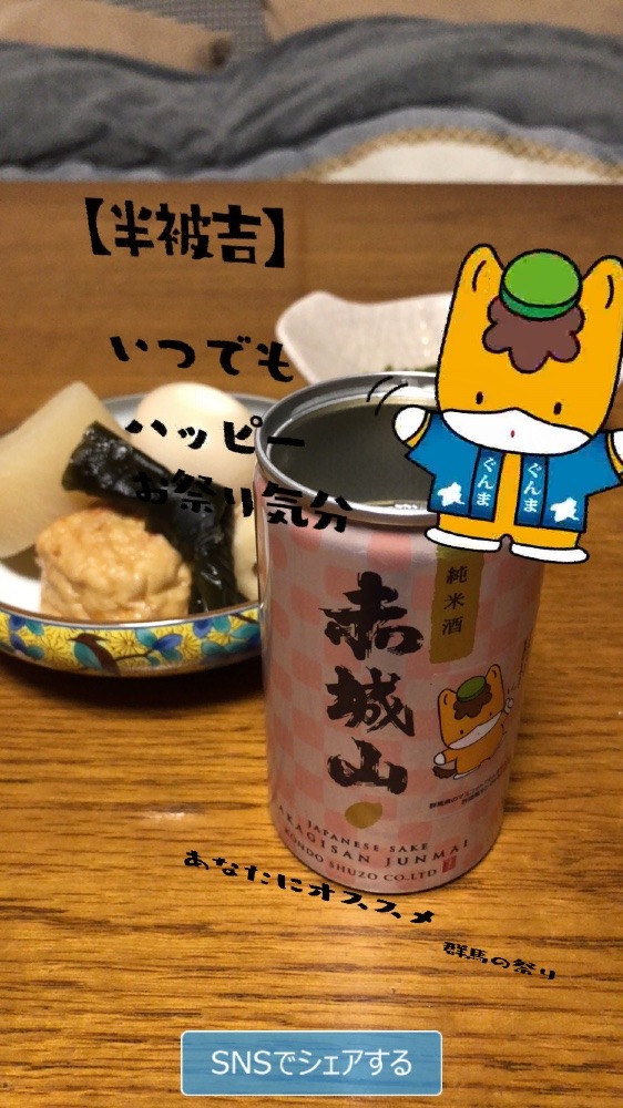 近藤酒造赤城山 純米酒 2021.01.0702今日はとっても寒かった。おでんと熱燗が飲みたい。 でも飲みには行けず、スーパーへ。 そこで見つけた「ぐんまちゃんと写真がとれる!」と書かれた赤城山のアルミ缶。ピンク色で可愛い。鍋のお湯で、おかんに挑戦。どのくらい温めるか、一口、また一口と飲みながら…。 アプリを使ってぐんまちゃんの写真も撮れて、大満足😊報告する Tweet Share +1 Pocket Pin it 投稿者 さいか 群馬県 フォローするコメントこの記事へのコメントはありません。コメントするためには、 ログイン してください。