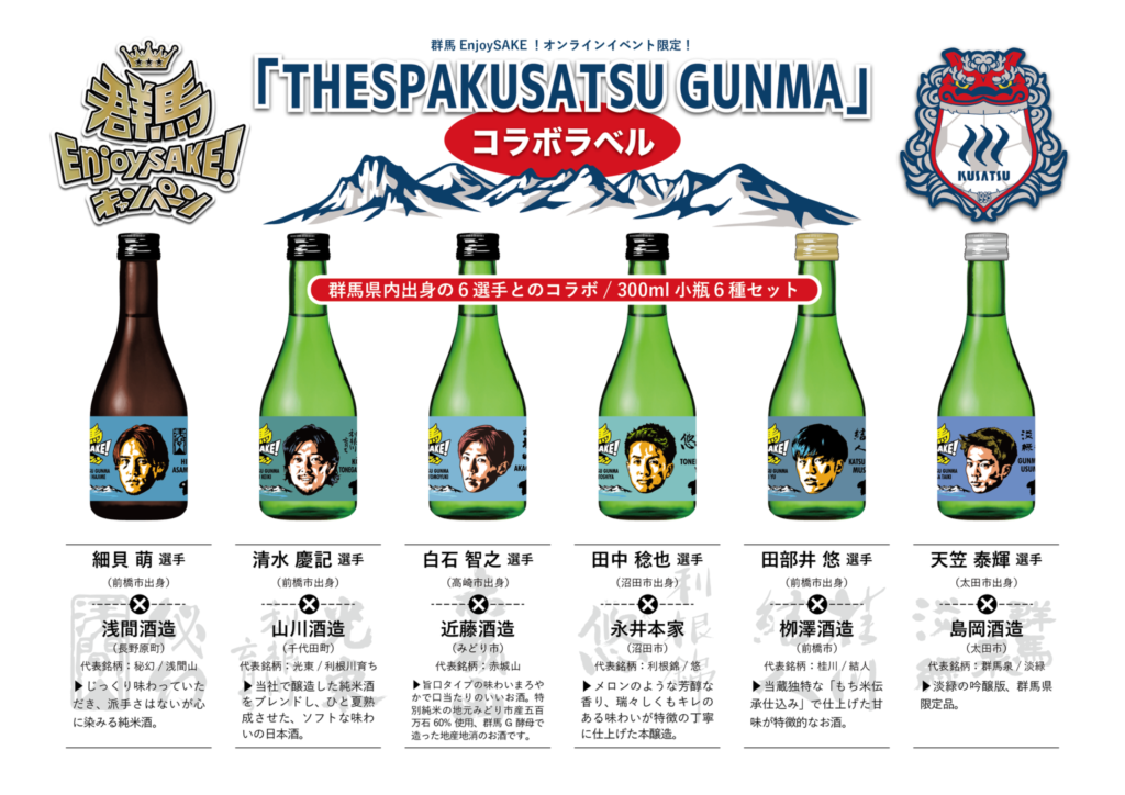 群馬EnjoySAKE!キャンペーンでコラボさせていただいたザスパクサツ群馬さん。群馬県出身6選手の顔がデザインされた300ml6本セット