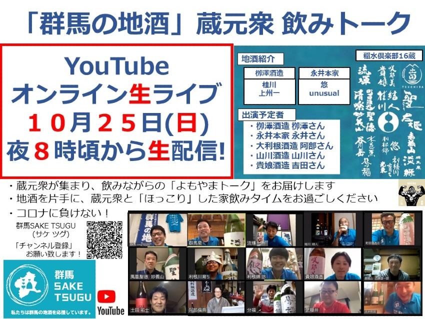 「群馬の地酒」蔵元・杜氏による飲みながらの生トークライブ配信を観ながら、楽しい家飲み時間を過ごしいただけたらと思います。