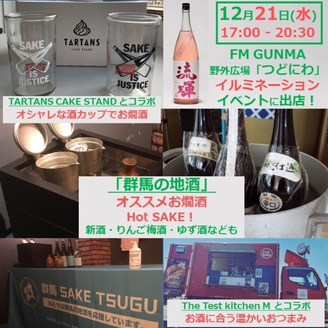 当日17時から「群馬の地酒」のお燗酒を提供するブースを、キッチンカーのThe Test kitchen M(エンメ)さんとのコラボにより出店することが決まりました!