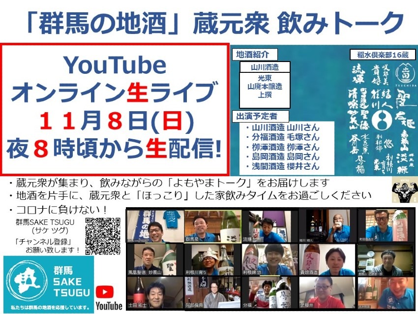 「群馬の地酒」蔵元・杜氏による飲みながらの生トークライブ配信を観ながら、楽しい家飲み時間を過ごしいただけたらと思います。