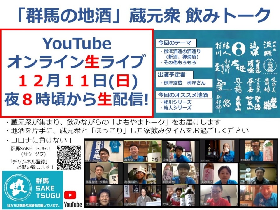 「群馬の地酒」蔵元・杜氏による飲みながらの生トークライブ配信を観ながら、楽しい家飲み時間を過ごしいただけたらと思います。