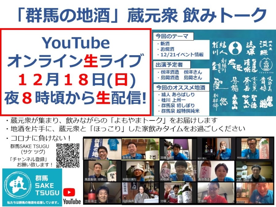 「群馬の地酒」蔵元・杜氏による飲みながらの生トークライブ配信を観ながら、楽しい家飲み時間を過ごしいただけたらと思います。