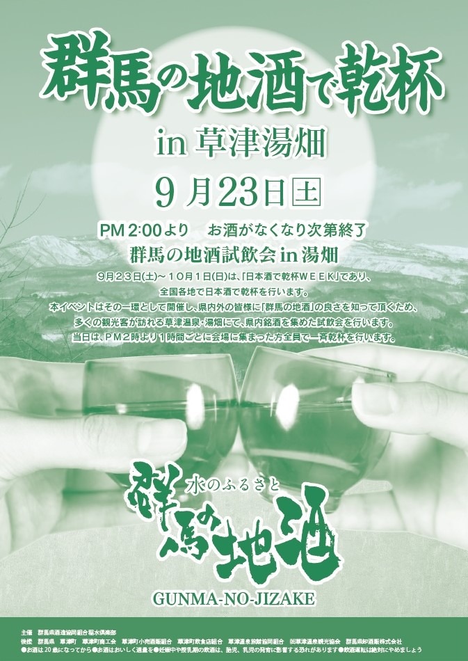日本酒造組合中央会による「全国一斉 日本酒で乾杯!」キャンペーンの一環で、10月1日「日本酒の日」にちなみ、9月23日から10月1日までを「日本酒で乾杯WEEK」として、全国各地で日本酒で乾杯が行われるもので、群馬県では、草津温泉湯畑にてイベントを行うものです。