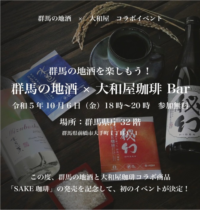 群馬の地酒と大和屋珈琲のコラボ商品「SAKE珈琲」の発売を記念して、初のコラボイベントとなります。