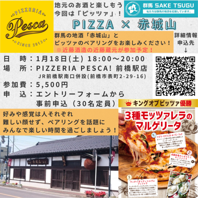 当日は、近藤蔵元にも御参加いただき、ピッツァと日本酒「赤城山」のペアリングをお楽しみいただきます!