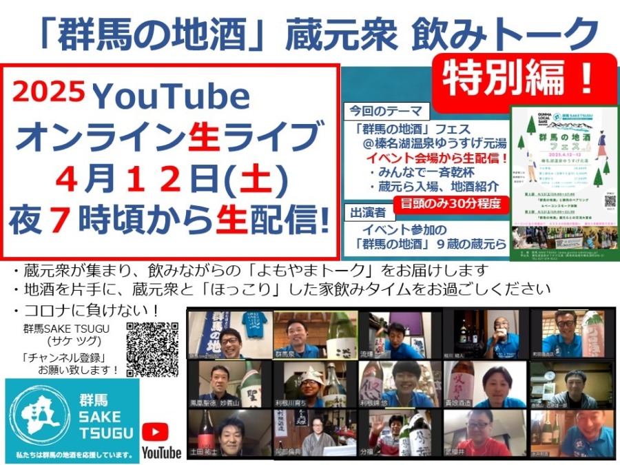 「群馬の地酒」を応援している群馬SAKETSUGUが、「群馬の地酒」蔵元や杜氏らをゲストに招き、飲みながらの生トークライブを配信。