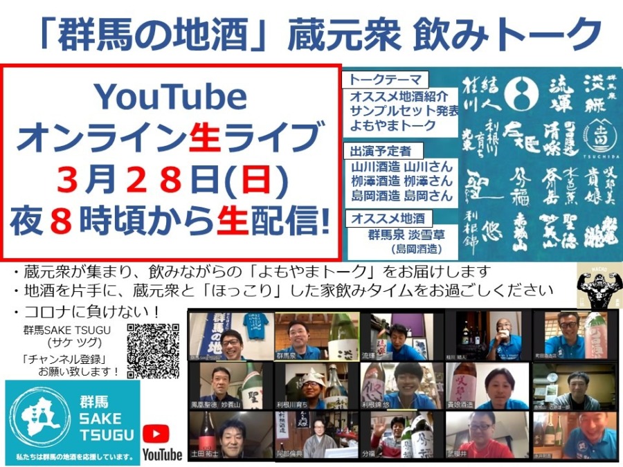 新型コロナウィルスの影響で、「群馬の地酒」に関するイベントが軒並み中止となる状況を受けて、何かできることはないかと群馬SAKE TSUGUが企画し、蔵元に声をかけて開催するものです。