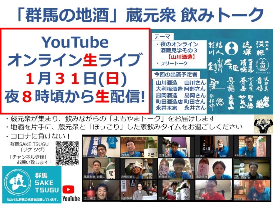 「群馬の地酒」蔵元・杜氏による飲みながらの生トークライブ配信を観ながら、楽しい家飲み時間を過ごしいただけたらと思います。