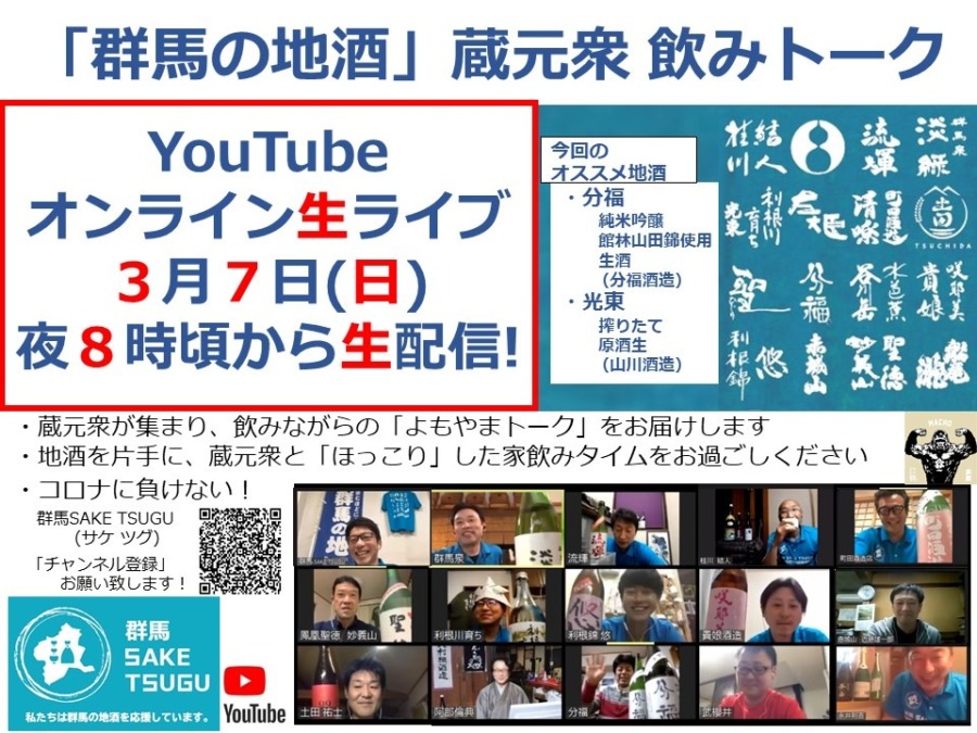 「群馬の地酒」蔵元・杜氏による飲みながらの生トークライブ配信を観ながら、楽しい家飲み時間を過ごしいただけたらと思います。