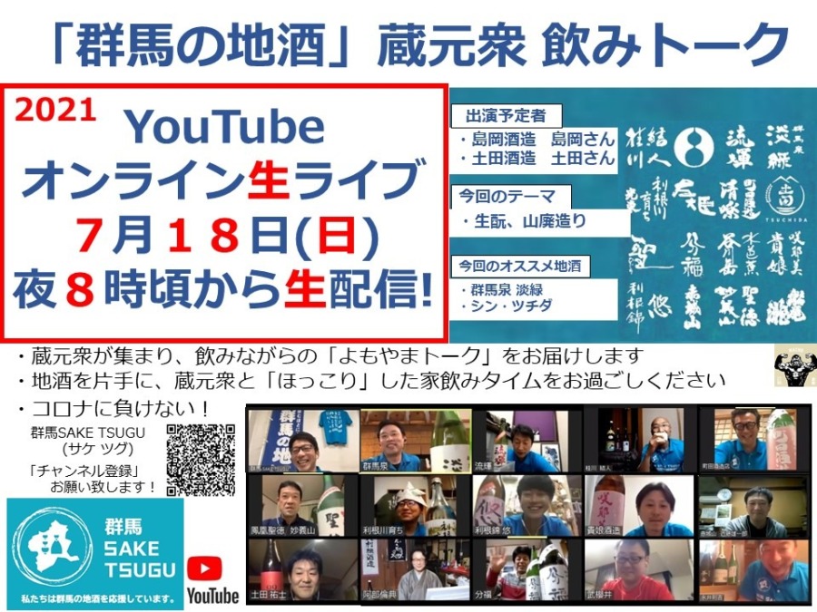 「群馬の地酒」蔵元・杜氏による飲みながらの生トークライブ配信を観ながら、楽しい家飲み時間を過ごしいただけたらと思います。