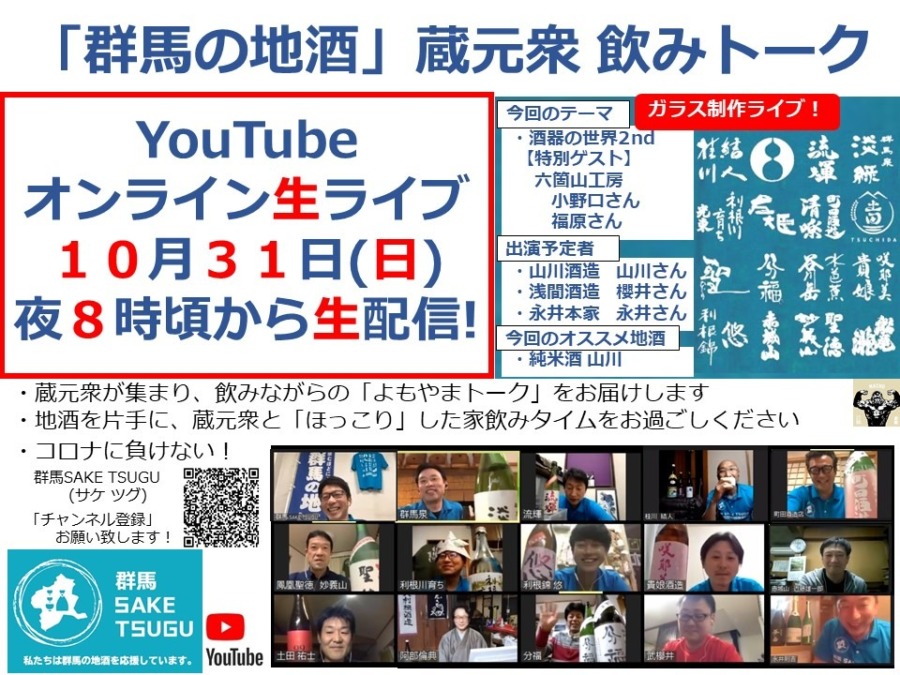 「群馬の地酒」蔵元・杜氏による飲みながらの生トークライブ配信を観ながら、楽しい家飲み時間を過ごしいただけたらと思います。