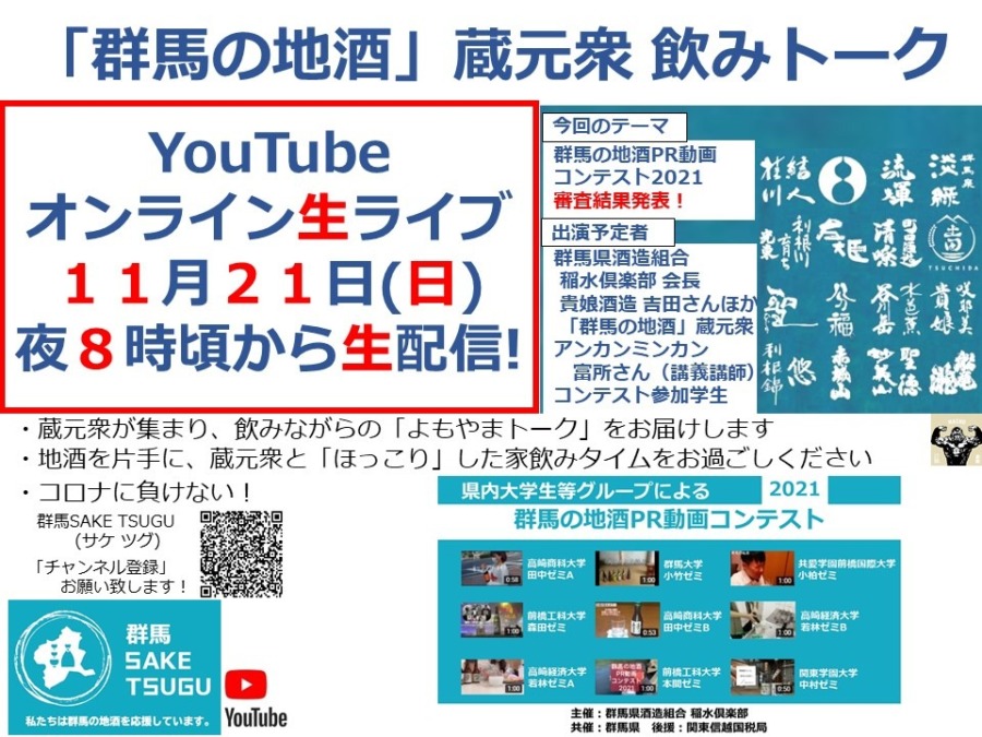 「群馬の地酒」蔵元・杜氏による飲みながらの生トークライブ配信を観ながら、楽しい家飲み時間を過ごしいただけたらと思います。