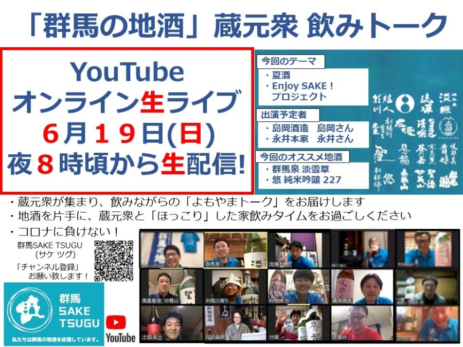 新型コロナウィルスの影響で、「群馬の地酒」に関するイベントが軒並み中止となる状況を受けて、何かできることはないかと群馬SAKE TSUGUが企画し、蔵元に声をかけて開催するものです。