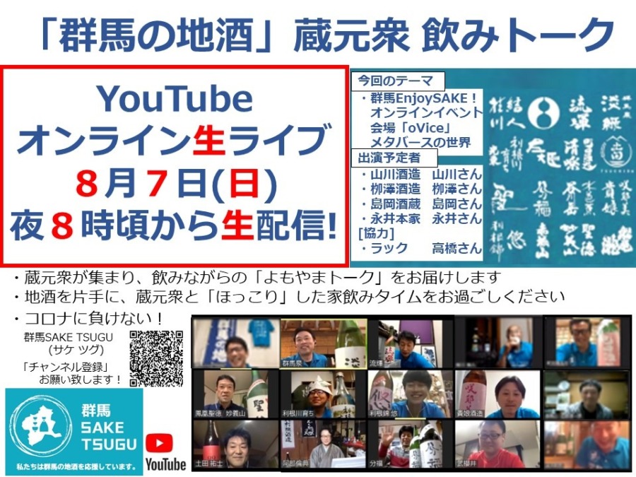 新型コロナウィルスの影響で、「群馬の地酒」に関するイベントが軒並み中止となる状況を受けて、何かできることはないかと群馬SAKE TSUGUが企画し、蔵元に声をかけて開催するものです。