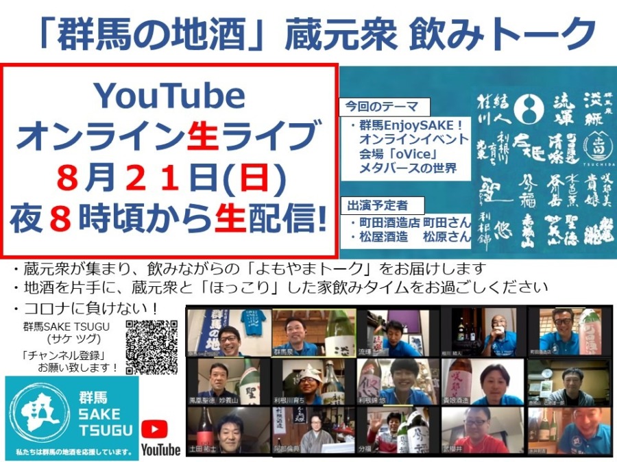 「群馬の地酒」蔵元・杜氏による飲みながらの生トークライブ配信を観ながら、楽しい家飲み時間を過ごしいただけたらと思います。