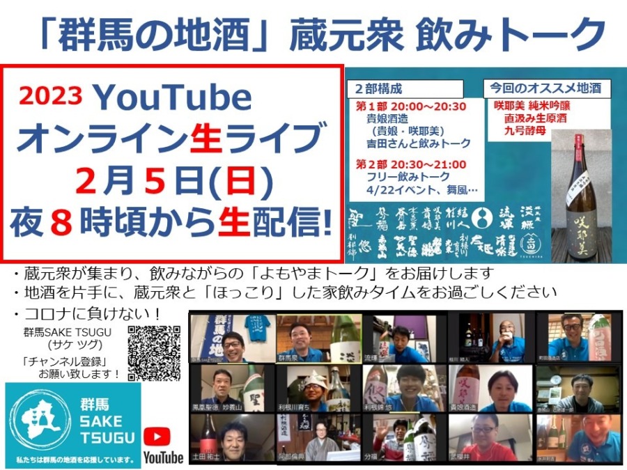 「群馬の地酒」蔵元・杜氏による飲みながらの生トークライブ配信を観ながら、楽しい家飲み時間を過ごしいただけたらと思います。