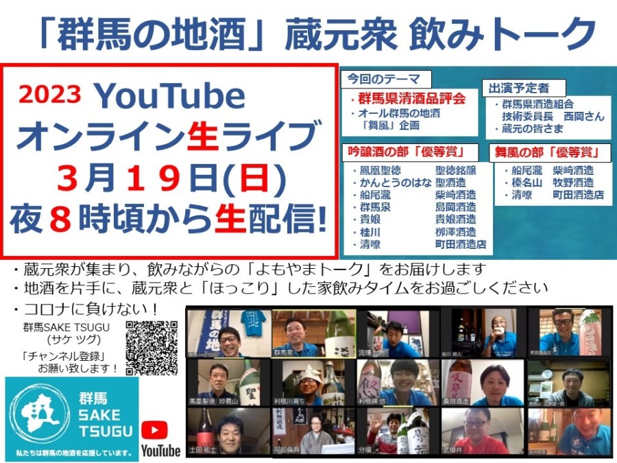 「群馬の地酒」蔵元・杜氏による飲みながらの生トークライブ配信を観ながら、楽しい家飲み時間を過ごしいただけたらと思います。