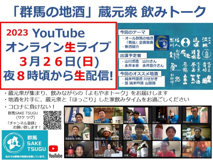 「群馬の地酒」蔵元・杜氏による飲みながらの生トークライブ配信を観ながら、楽しい家飲み時間を過ごしいただけたらと思います。