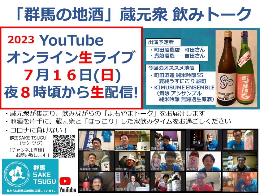 「群馬の地酒」蔵元・杜氏による飲みながらの生トークライブ配信を観ながら、楽しい家飲み時間を過ごしいただけたらと思います。