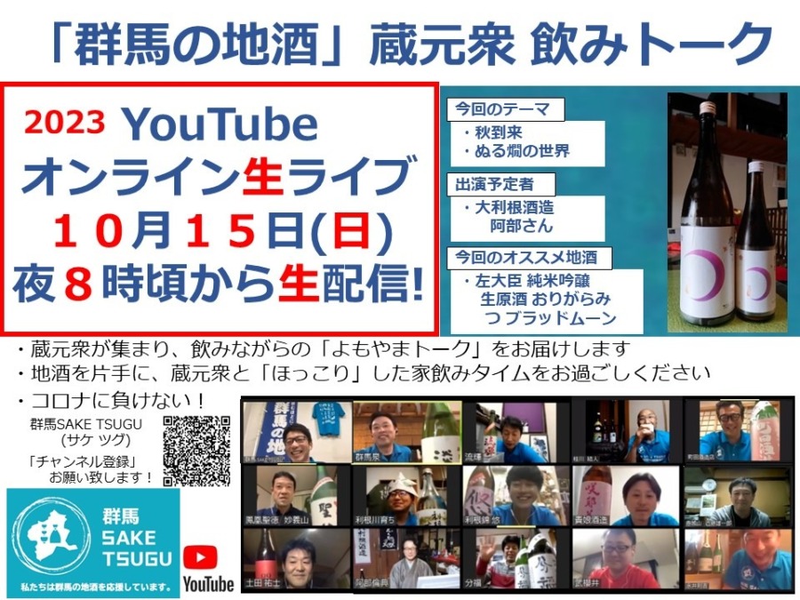 「群馬の地酒」を応援している群馬SAKETSUGUが、「群馬の地酒」蔵元や杜氏らをゲストに招き、飲みながらの生トークライブを配信。