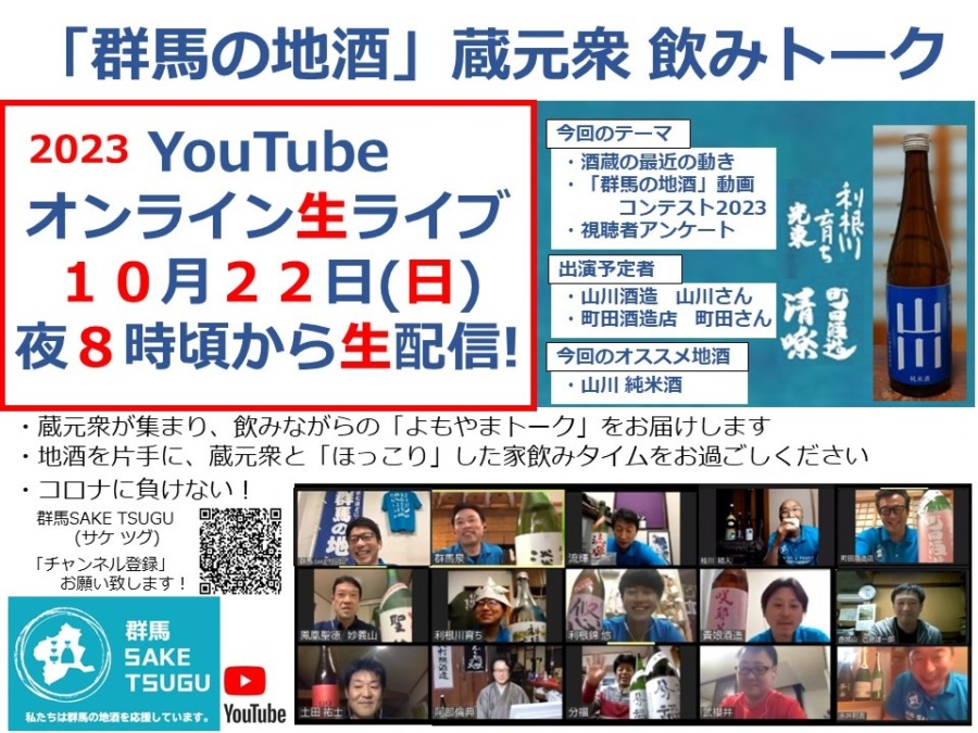 「群馬の地酒」を応援している群馬SAKETSUGUが、「群馬の地酒」蔵元や杜氏らをゲストに招き、飲みながらの生トークライブを配信。