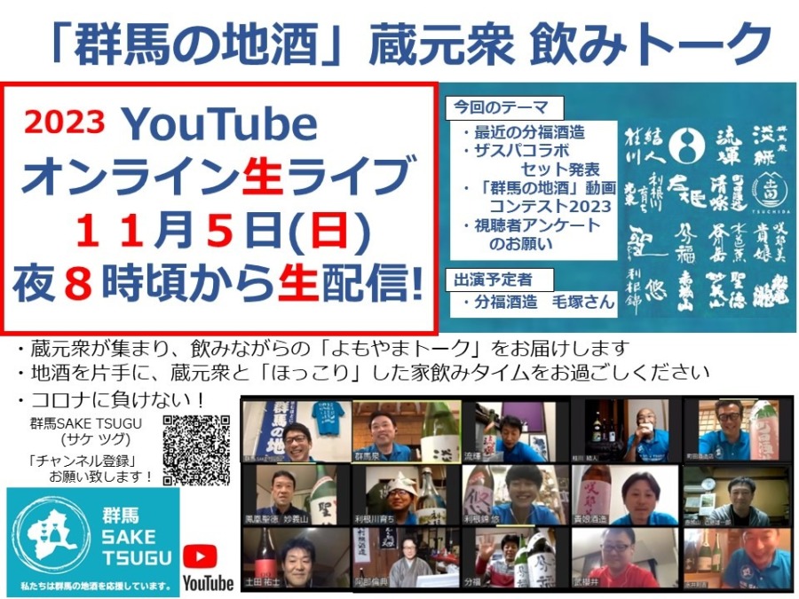 「群馬の地酒」を応援している群馬SAKETSUGUが、「群馬の地酒」蔵元や杜氏らをゲストに招き、飲みながらの生トークライブを配信。