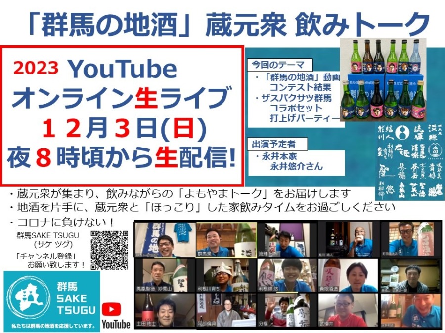 「群馬の地酒」を応援している群馬SAKETSUGUが、「群馬の地酒」蔵元や杜氏らをゲストに招き、飲みながらの生トークライブを配信。