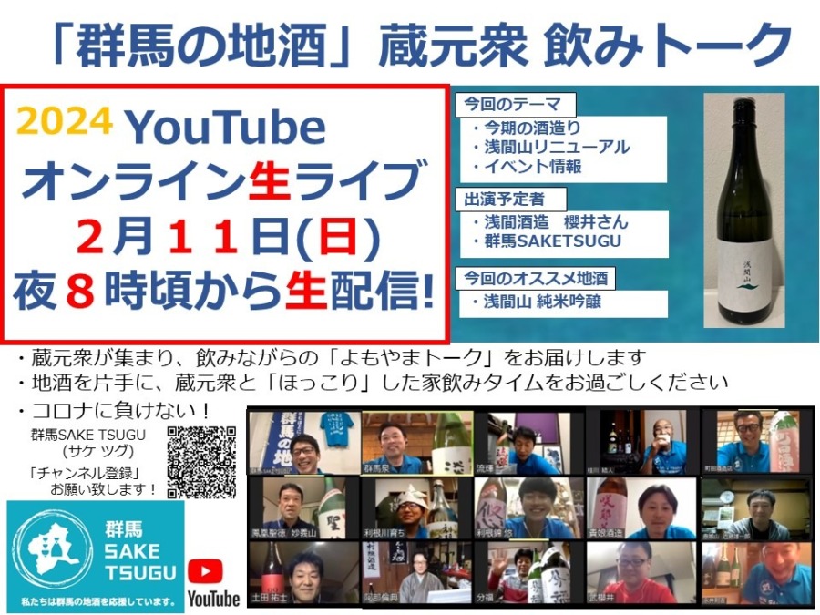 「群馬の地酒」を応援している群馬SAKETSUGUが、「群馬の地酒」蔵元や杜氏らをゲストに招き、飲みながらの生トークライブを配信。