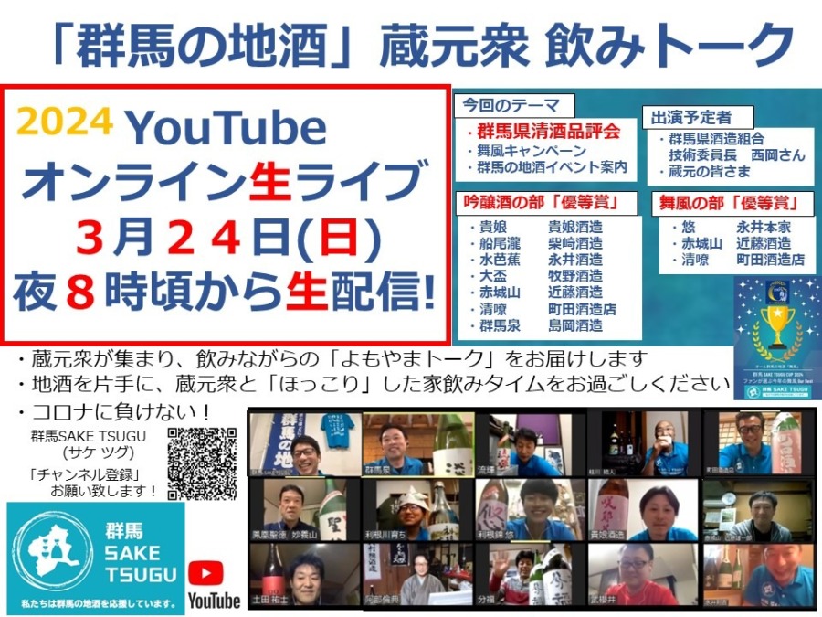 「群馬の地酒」を応援している群馬SAKETSUGUが、「群馬の地酒」蔵元や杜氏らをゲストに招き、飲みながらの生トークライブを配信。