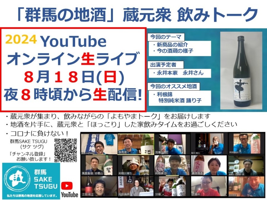 「群馬の地酒」を応援している群馬SAKETSUGUが、「群馬の地酒」蔵元や杜氏らをゲストに招き、飲みながらの生トークライブを配信。